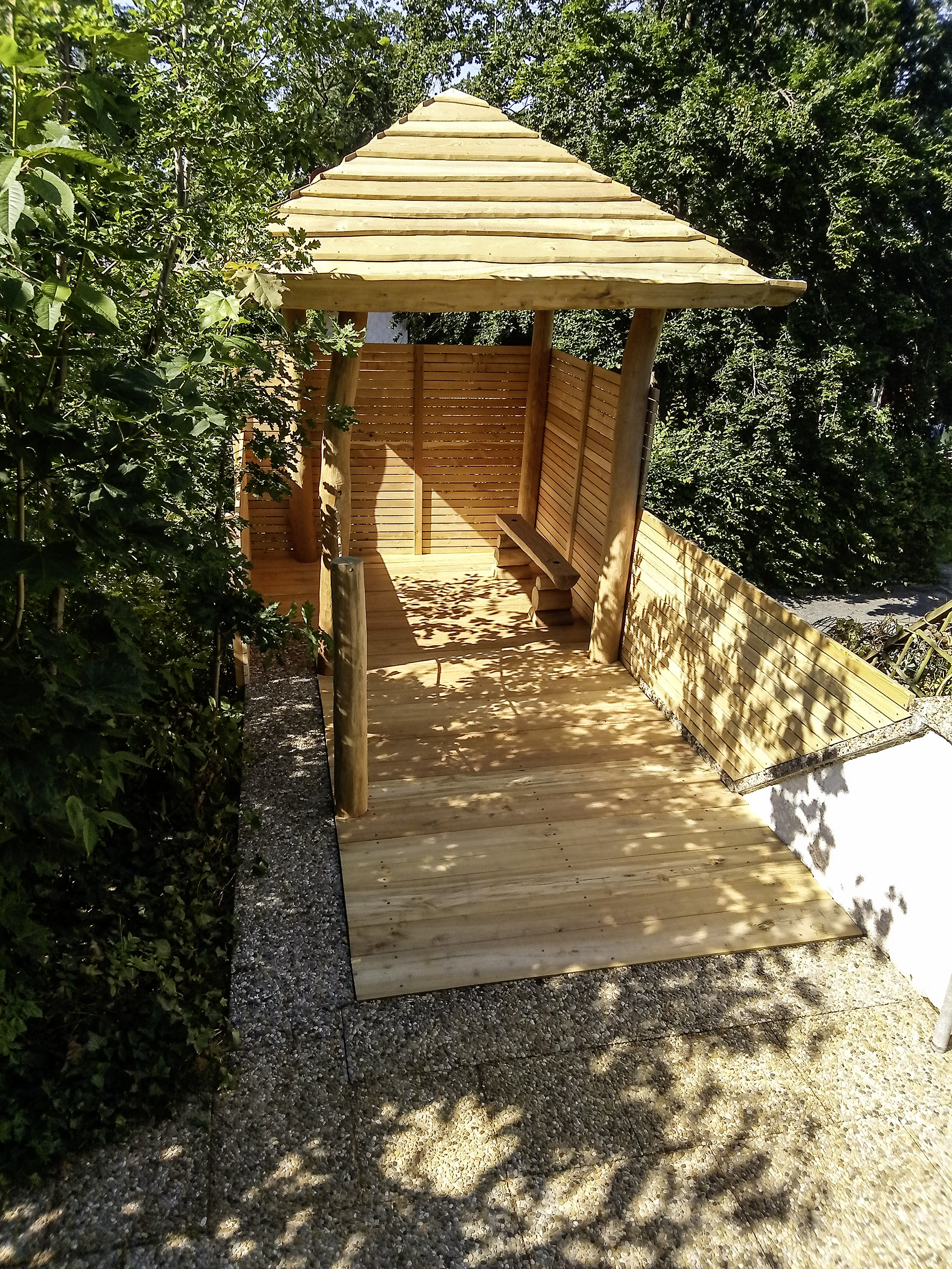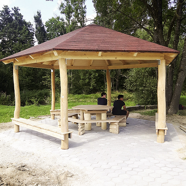 Pavillons sind in verschiedenen Formen als 6-eck, 5-eck oder 4-eck und unterschiedlichen Größen und Ausführungen, mit Holzdach oder Schindeln, verkleidet oder offen, möglich. Zusätzlich kann ihr individuell geplanter Pavillon mit Bänken und Tischen oder Sitzbalken ausgestattet werden.