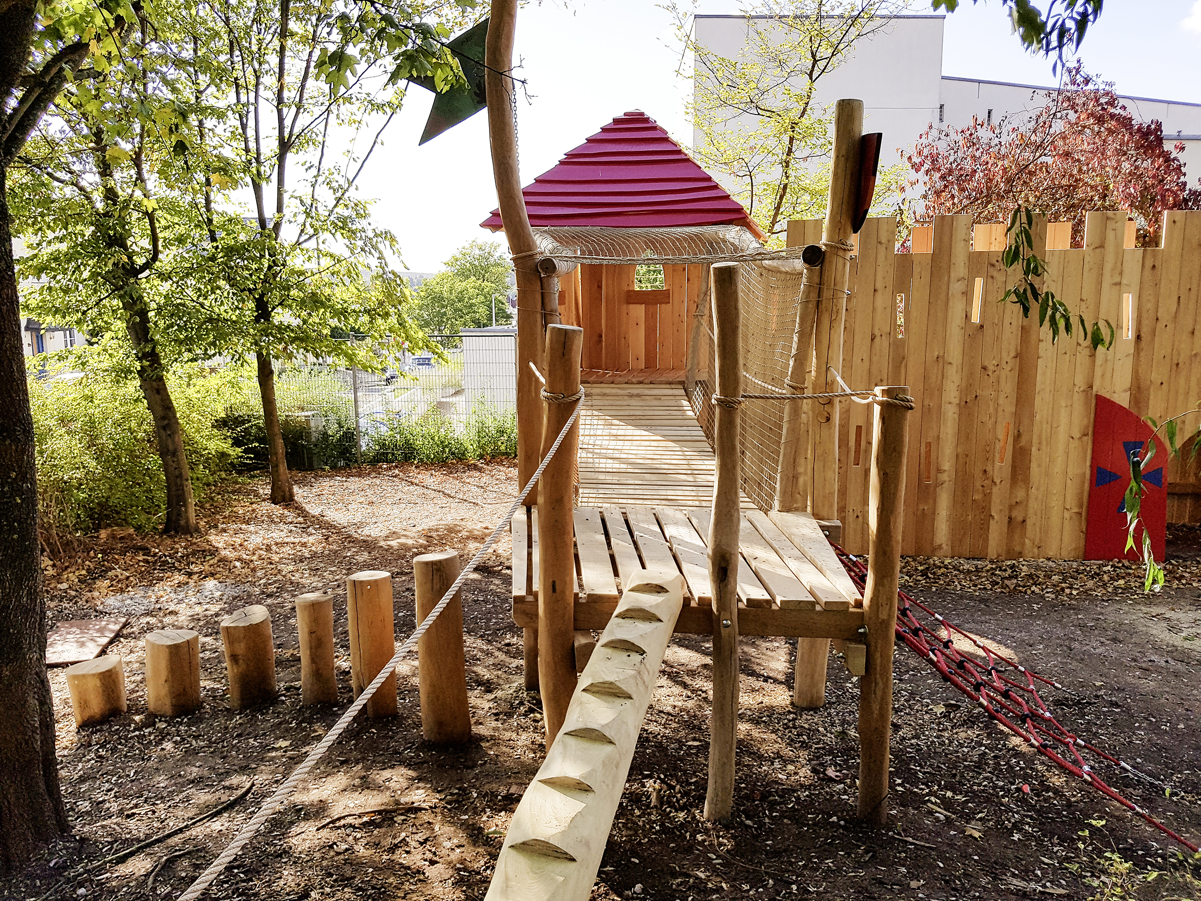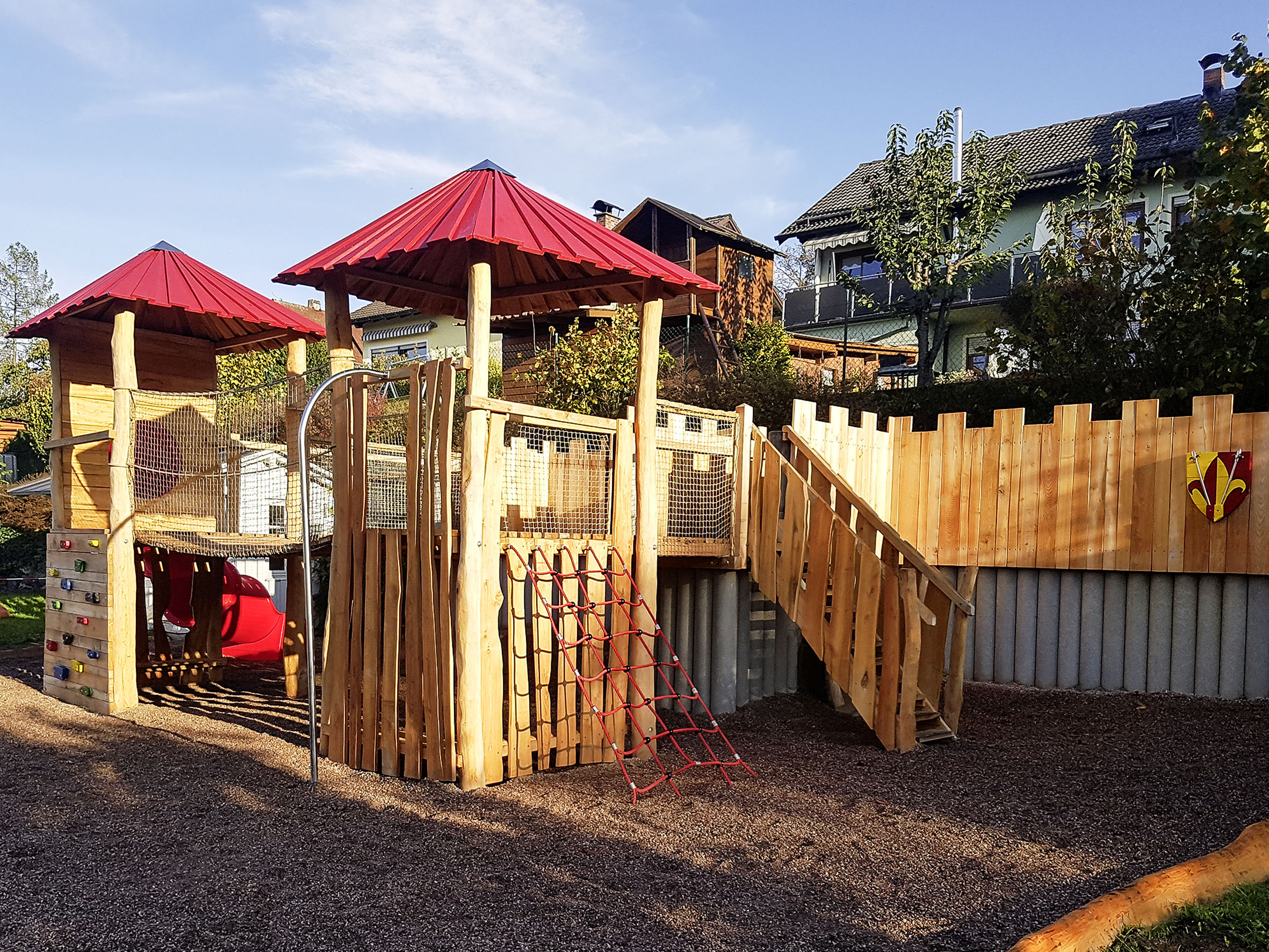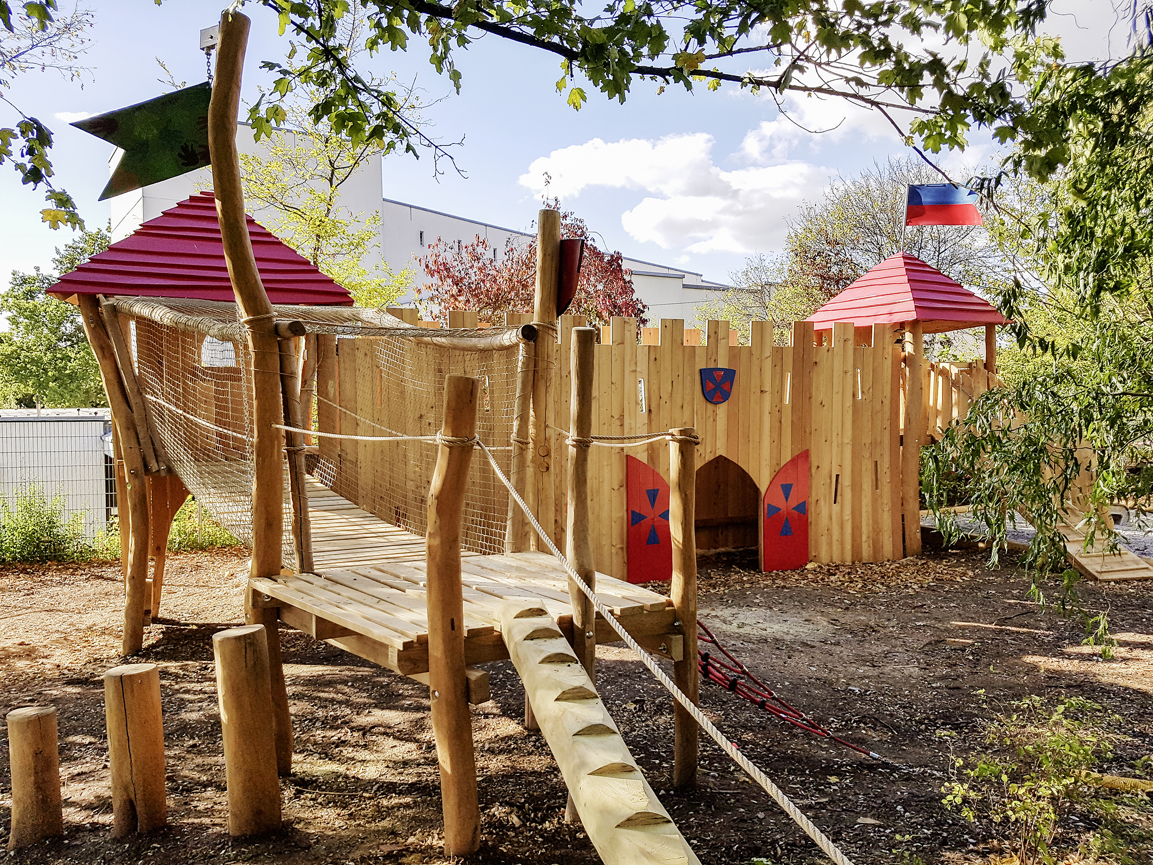 Der Themenspielplatz Ritterburg vereint viele Möglichkeiten in einem einzigen Spielkomplex. Sowohl unterschiedlichste Elemente zum aktiven Klettern als auch Rückzugsecken mit Tischen und Bänken ausgestattet, die zu Rollenspielen oder zum Ausruhen dienen, können individuell eingeplant werden. Den gestalterischen und baulichen Möglichkeiten sind praktisch keine Grenzen gesetzt – ob nun eine Raubritterburg mit Falltoren, Seilen und „Schießscharten“ oder ein Märchenschloss mit Klettertürmen und Zugbrücke geplant wird.
